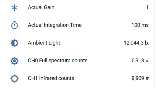 Note: These sensors do not have internal data checking and do not indicate any errors if data is not reliable. The sensors can be easily saturated if the gain is too high or the integration time is too long. In this case, readings can be very strange. It’s recommended to use automatic mode with a starting gain of 1X (default) and a starting integration time of 100ms (default) or even 50ms (if the sensor is in a very bright environment). Automatic mode with starting gain of 150X is not recommended; use it only if you are sure brightness will never exceed 200-300 lx.