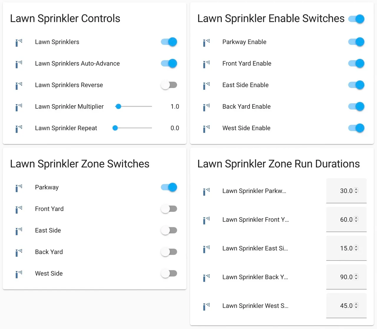 So why not just use the underlying switches to control the various sprinkler zones directly? As it relates to the sprinkler controller itself, the primary reason relates to state — that is, we need to be able to ensure that the switch state(s) are kept consistent with the configuration of the sprinkler controller. While it’s less important for systems that simply consist of one valve per zone, it becomes very important for systems with some additional complexity. Consider the example of a system with a pump and multiple distribution valves attached to said pump; the controller in this case is configured to switch the pump off three seconds before switching off any given distribution valve. If you suddenly manually switch off an underlying switch connected to one of these distribution valves, what happens to the pump? What should the sprinkler controller do? Should it switch the distribution valve back on?…or maybe just switch the pump off, too? In either case, based on its configuration, the pump was supposed be shut down before the valve, but you just went and turned off the valve. The pump could be damaged. There are many other similar situations such as this that may occur, the simplest of which is little more than ensuring that any given valve is switched off after some duration and does not remain on/open perpetually.